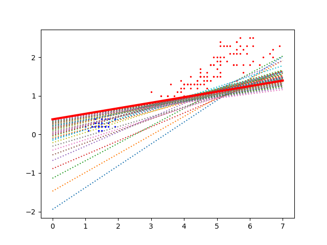 Dans le cas où il y a deux entrées, on peut réaliser une représentation graphique des exemples, de la droite résultant de la DGS et aussi les droites au fil des itérations.