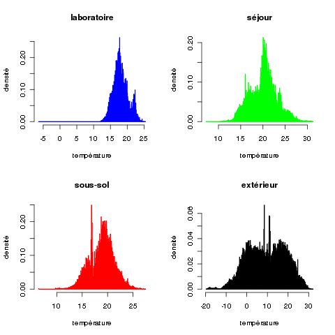 Afin d'avoir une vision synthétique des 4 séries de températures, on va construire un graphique ayant leurs 4 histogrammes dans la même fenêtre :